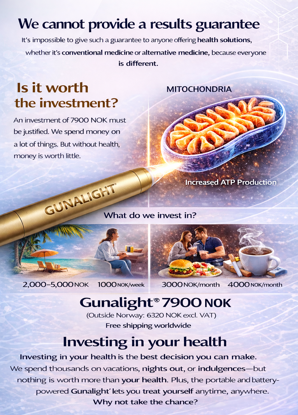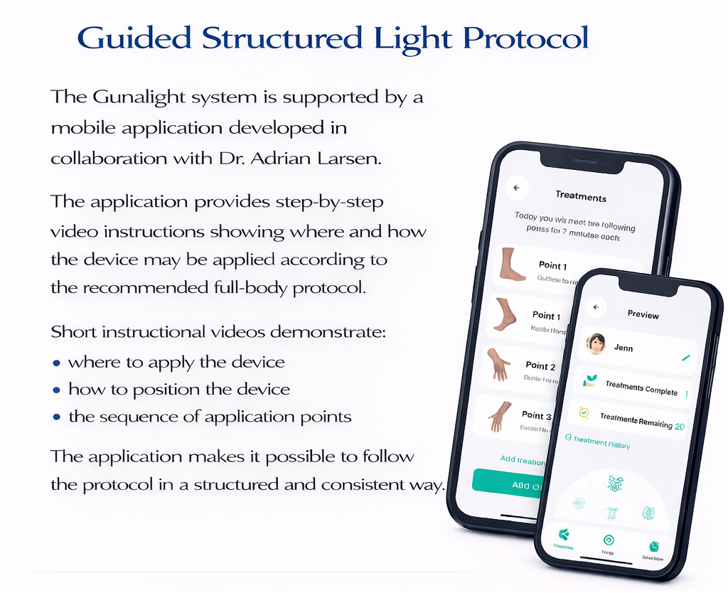 Legal Disclaimer – Gunalight Energy Therapy; In line with strict international legislation relating to the sale and distribution of products and services that can be perceived as alternative health, we are required to clarify the following: The information and services related to Gunalight Energy Therapy are not intended to diagnose, treat, cure or prevent any disease. Our products and forms of therapy are to be considered complementary, and not an alternative to traditional medical treatment. Gunalight Energy Therapy is an energy-based method that seeks to support the body's natural balance and well-being. We make no guarantees for results, as the effect may vary individually. The service is not intended to replace medical advice or treatment from authorized healthcare professionals. By using our products or services, you accept that this is done at your own risk. You disclaim Gunalight, its therapists and partners any responsibility for any physical, mental or emotional reactions that may occur following the treatment. We always recommend consulting a doctor or other authorized healthcare professional in case of illness or health complaints.
